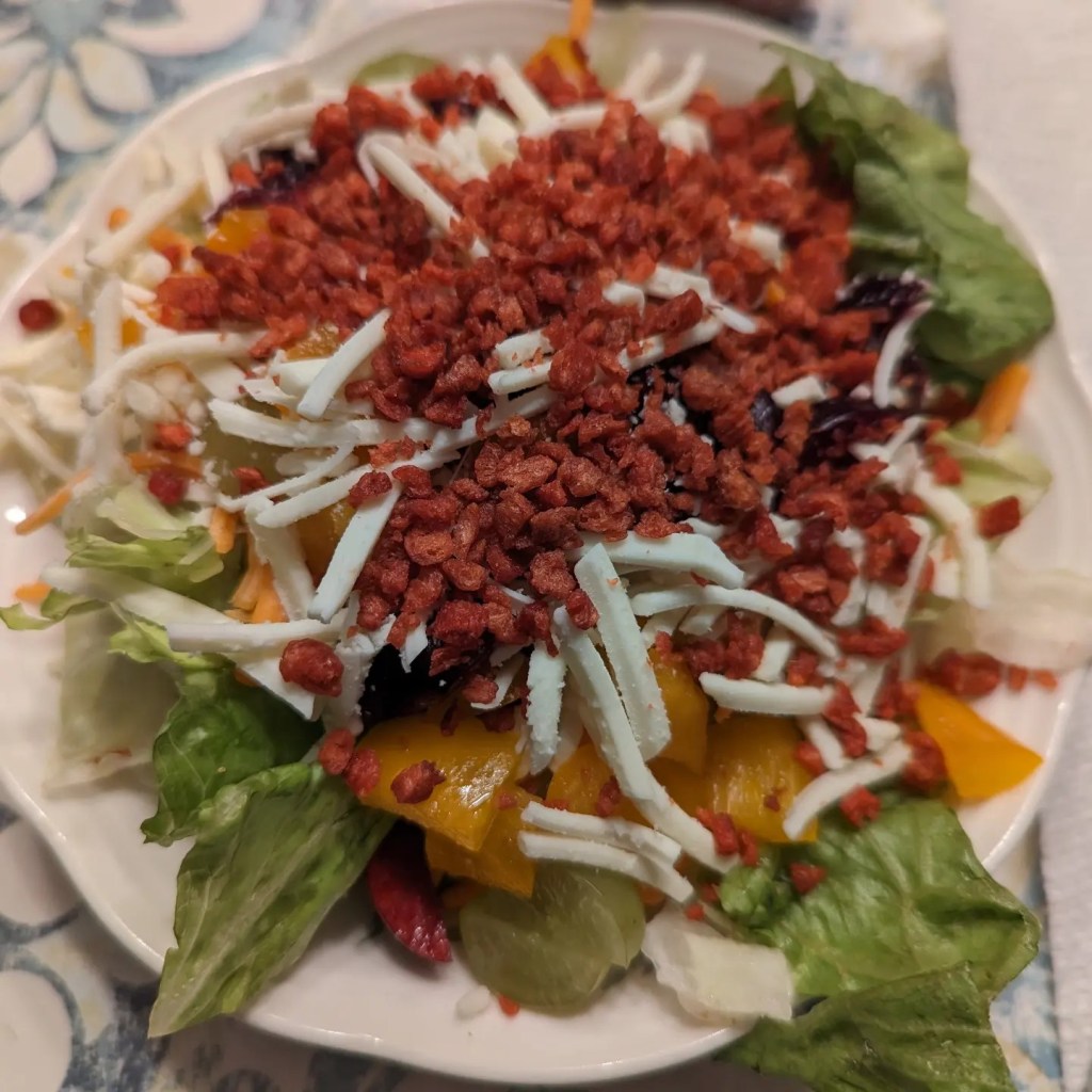 Salad. Peppers, carrots, grapes, cherries, bacos, and Violife cheese.