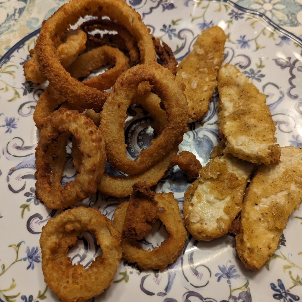 Dinner. August 25th, 2023. Whole Foods onion rings and Gardein chicken fingers. Share this: Click to share on X (Opens in new window) X Click to share on Facebook (Opens in new window) Facebook Like Loading... Related
