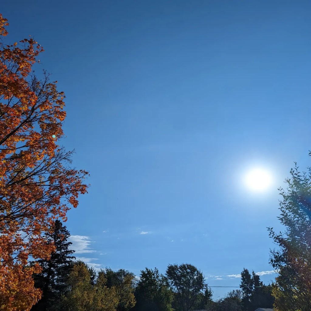 Autumn. October 24th, 2023. Blue skies in upstate Western New York. Temps are in the fifties. Share this: Click to share on X (Opens in new window) X Click to share on Facebook (Opens in new window) Facebook Like Loading... Related