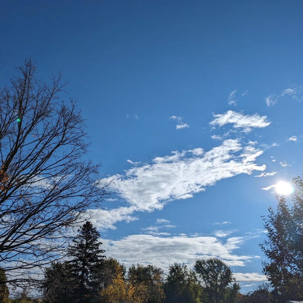Autumn. October 31st, 2023. Blue skies in upstate Western New York. Temps are in the thirties. Share this: Click to share on X (Opens in new window) X Click to share on Facebook (Opens in new window) Facebook Like Loading... Related
