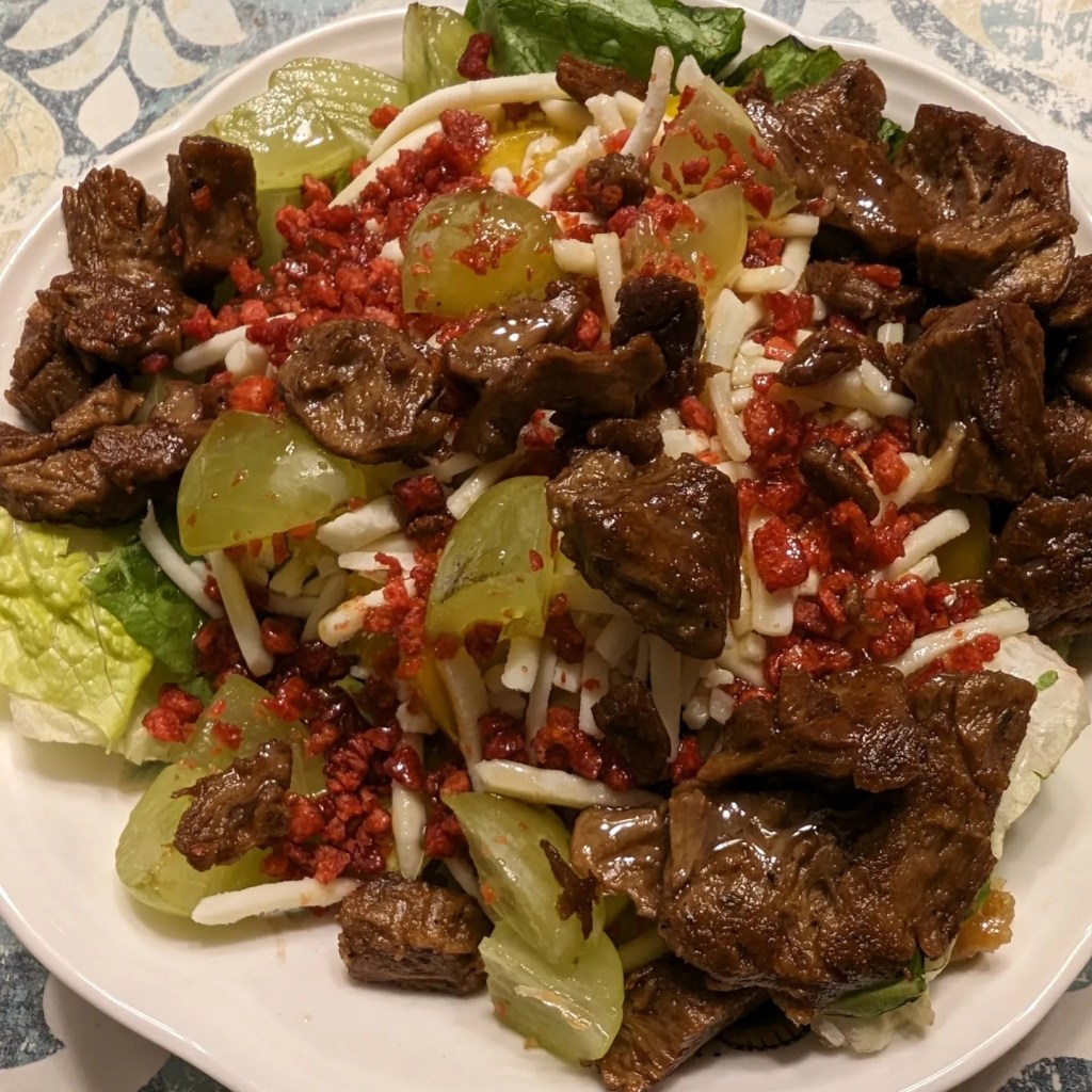 Dinner. November 15th, 2023. Salad. Peppers, grapes, bacos, Beyond Meat steak, and Violife cheese. Share this: Click to share on X (Opens in new window) X Click to share on Facebook (Opens in new window) Facebook Like Loading... Related