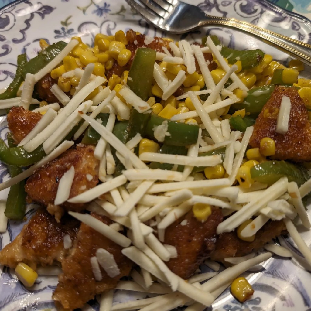 Dinner. December 27th, 2023. Whole Foods chicken, corn, peppers, and Violife cheese. Share this: Click to share on X (Opens in new window) X Click to share on Facebook (Opens in new window) Facebook Like Loading... Related