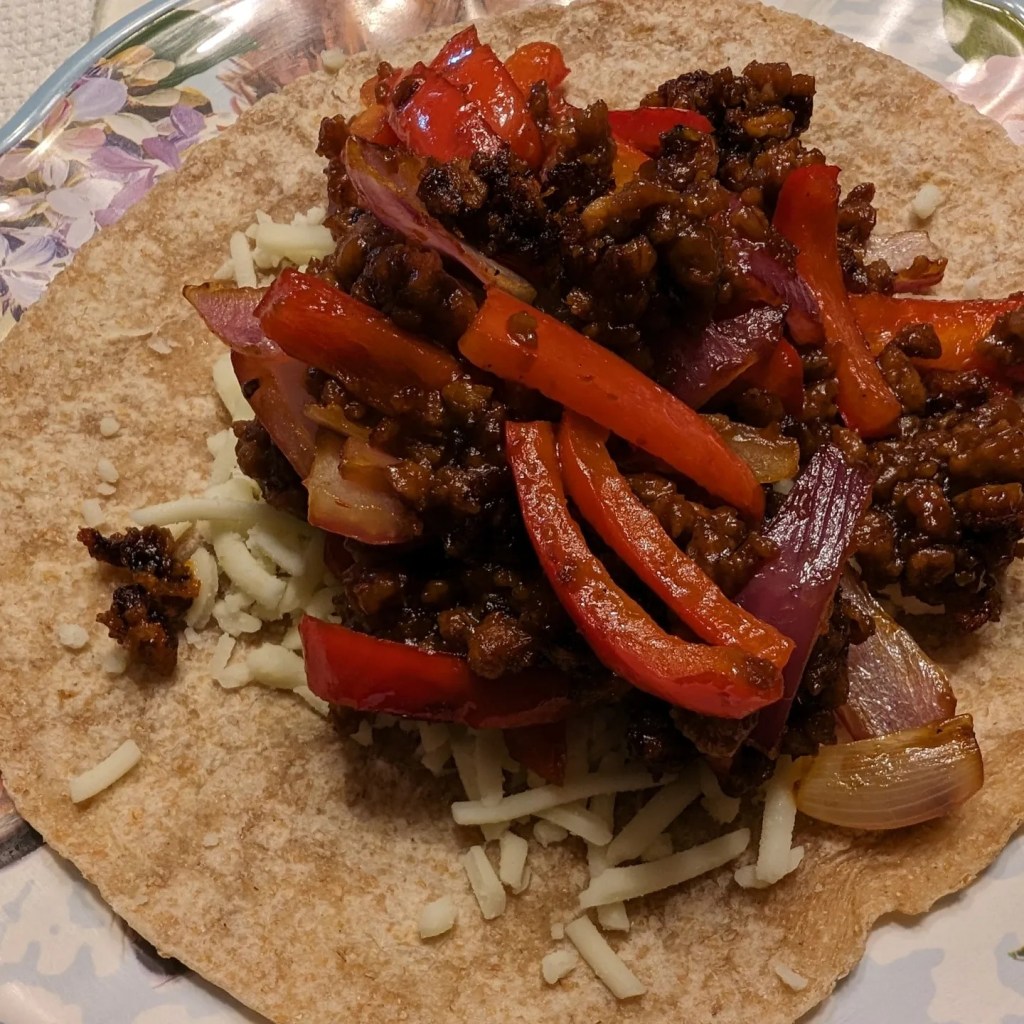 Burritos. Peppers, onion, Gardein ground beef, and Violife cheese.