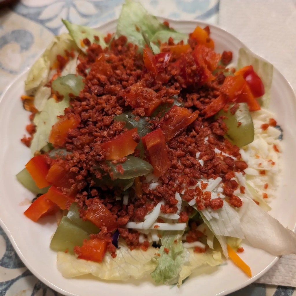 Salad. Gardein turkey, peppers, bacos, and Violife cheese.