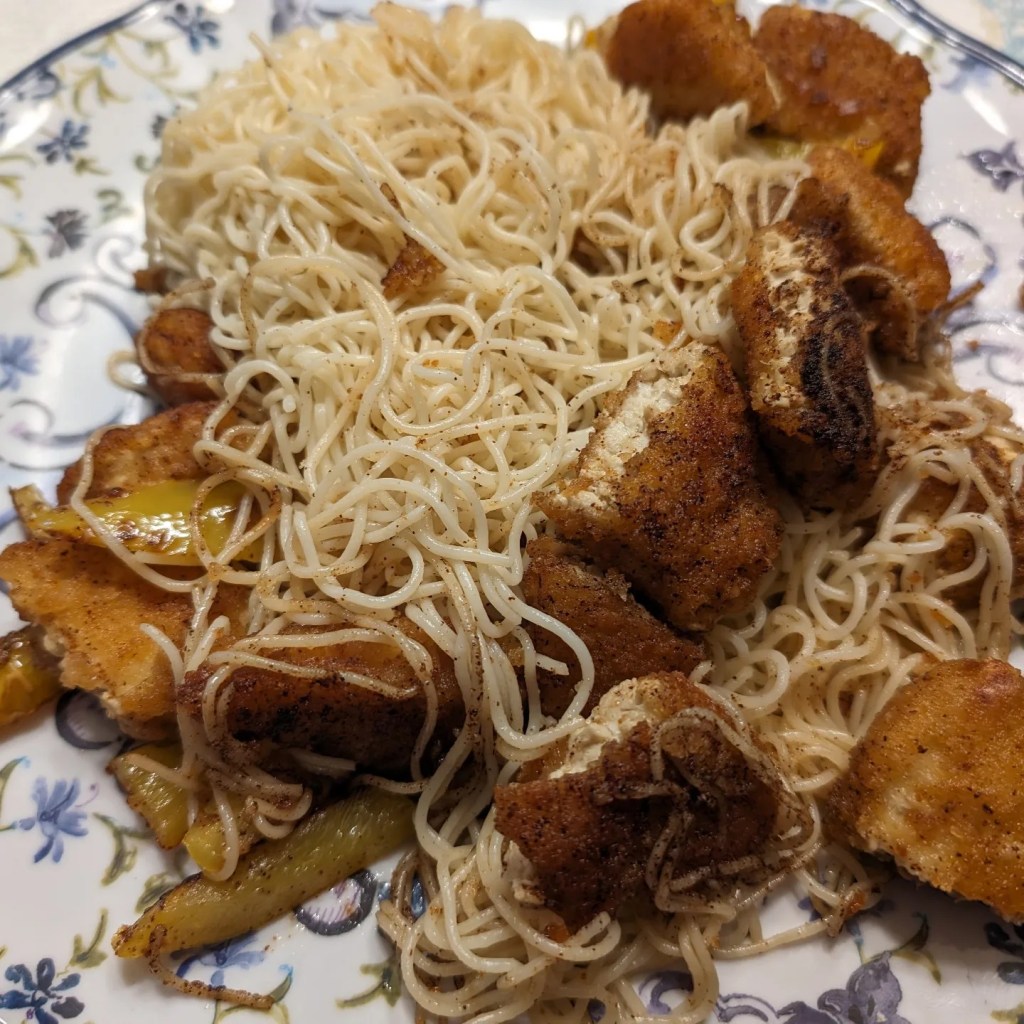 Beyond Meat chicken and Whole Foods veggie lo mein.