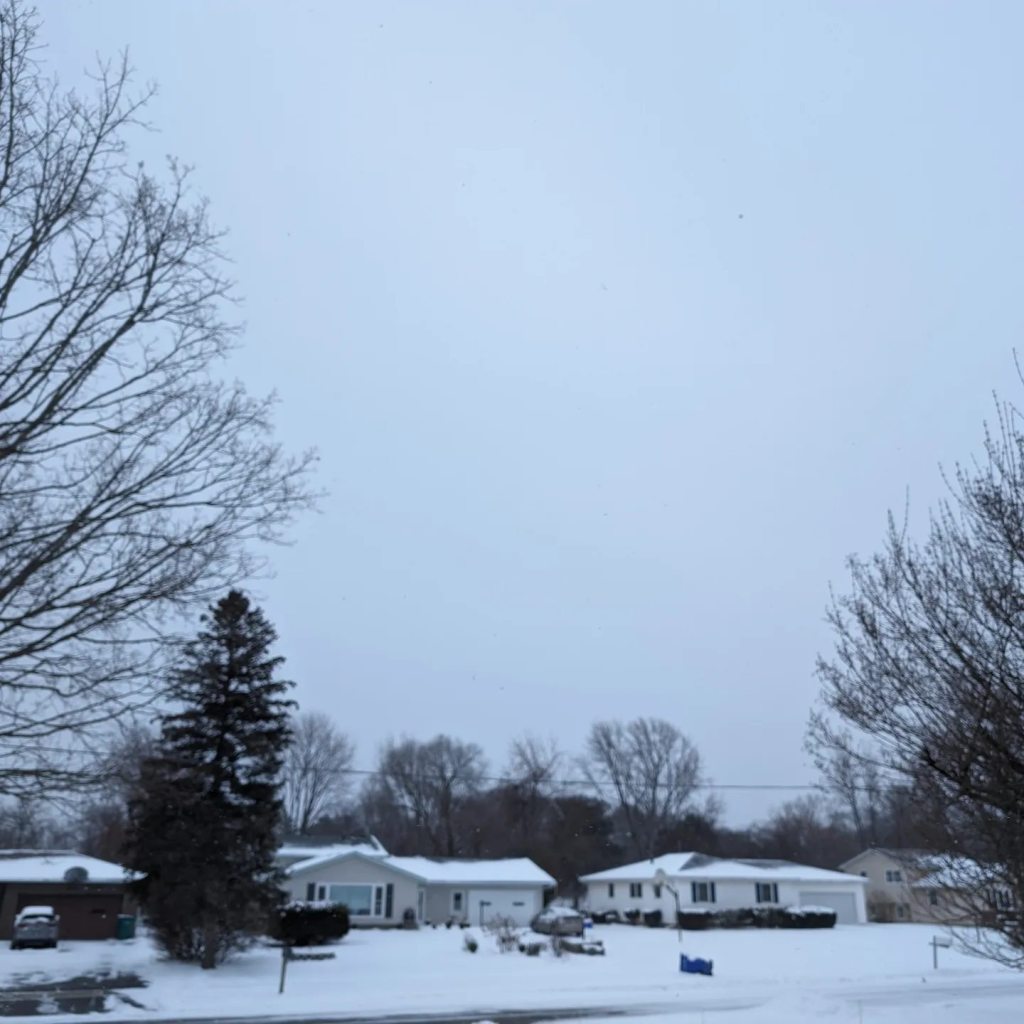 Grey skies and snow in upstate Western New York. Temps are in twenties.
